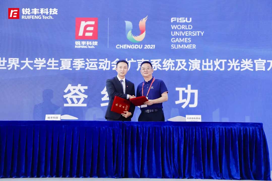 锐丰建声灯光音响器材工程安装有限公司签约成都大运会,成为大运会扩声系统和演出灯光类官方独家供应商。这是锐丰科技继北京奥运会、广州亚运会、南京青奥会、深圳大学生运动会、印尼亚运会后,再一次成为了世界级运动会-成都大运会扩声系统和演出灯光类官方独家供应商。