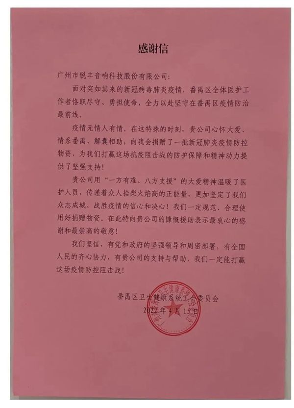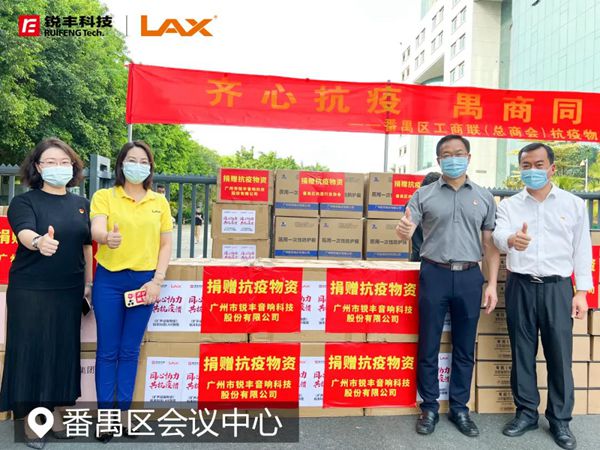 活动中,由广州市锐丰音响科技股份有限公司董事副总经理、LAX品牌负责人陆秀冰代表企业出席本次捐赠活动,共捐赠扩声器300套。“抗击疫情,人人有责”,作为番禺本土企业必须增强大局意识,践行社会责任,展现企业担当,为我区打赢疫情防控这场硬仗贡献禺商力量!