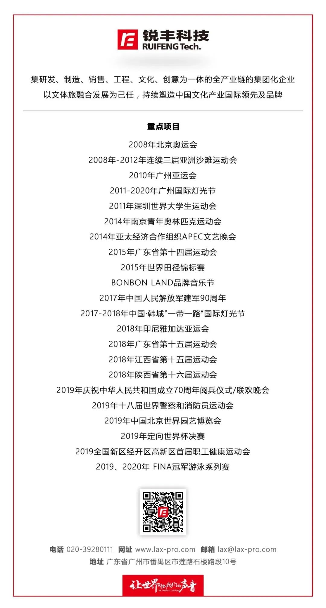 30年间,我们持续秉承“让世界听见我们的声音”的企业理念,在夯实建立科学高效的运营体系、开拓全球化布局以及延伸多元化发展路径等方面进行战略部署,以清晰的顶层规划为路线,以赋能业务为导向,为每一个项目量身定制,形成差异化、创新化,让世界看见中国品牌的实力。